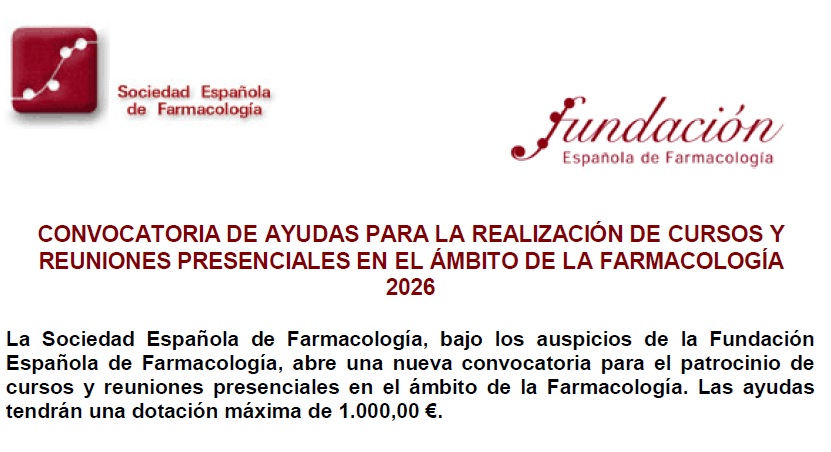 La Sociedad Española de Farmacología, bajo los auspicios de la Fundación Española de Farmacología, abre una convocatoria para el patrocinio de cursos y reuniones presenciales en el ámbito de la Farmacología.